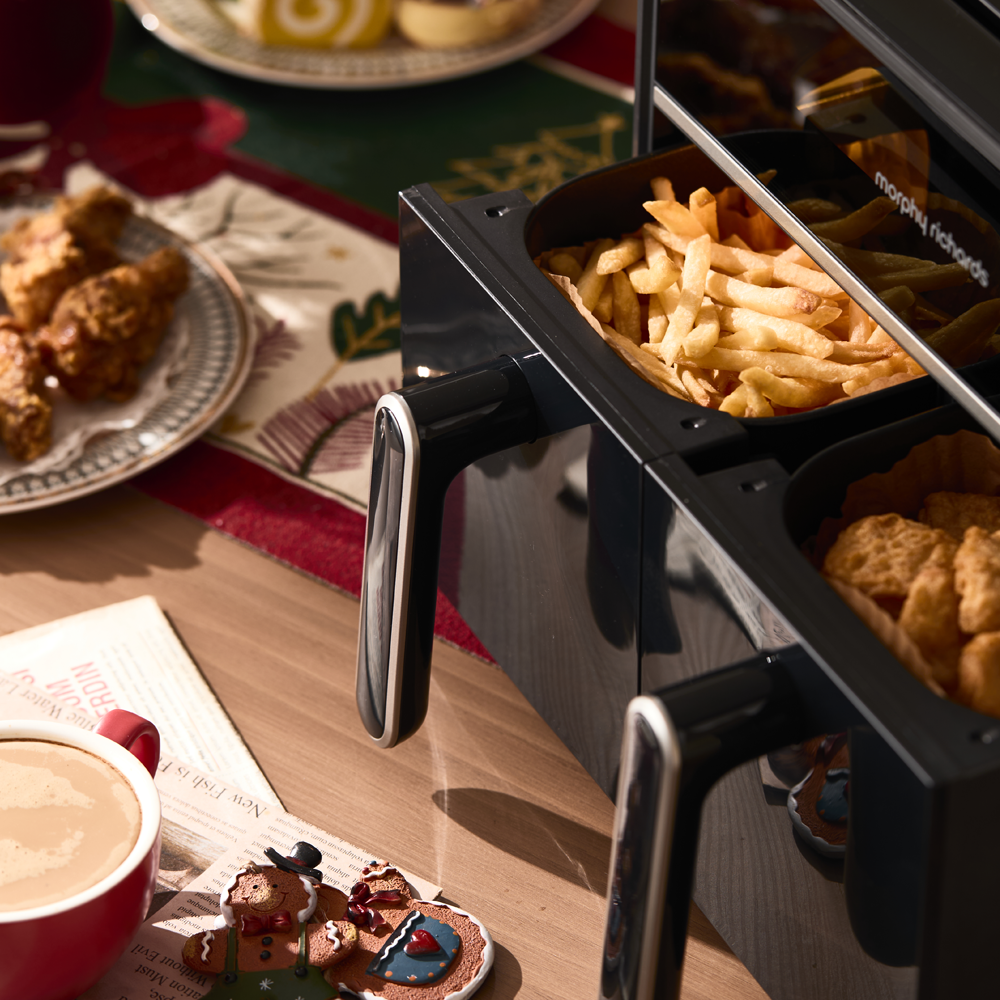 Descubre una forma más inteligente y práctica de cocinar con la freidora de aire Digital Dual Basket de 7.2 litros. Gracias a su sistema de doble compartimento, puedes preparar dos alimentos distintos al mismo tiempo, cada uno con su propia configuración de temperatura y tiempo.